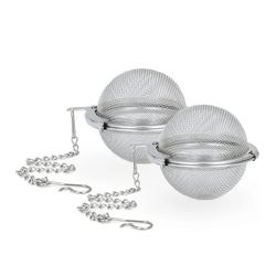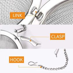 This tea strainer ball mesh was made up with Stainess Steel, size about 2" diameter mesh ball an 4.5" chain, infusers with extra fine mesh screen that catches finer particles, and that ensures particle and debris free steeping. allow the loose tea leaves to fully expand while steeping, so you get that perfect fresh cup of tea every time use use them.The attached chain allows you to hang the tea balls from a teapot, tea cup, coffee mug, panhandle or stockpot. Easy to clean and dishwasher safe.